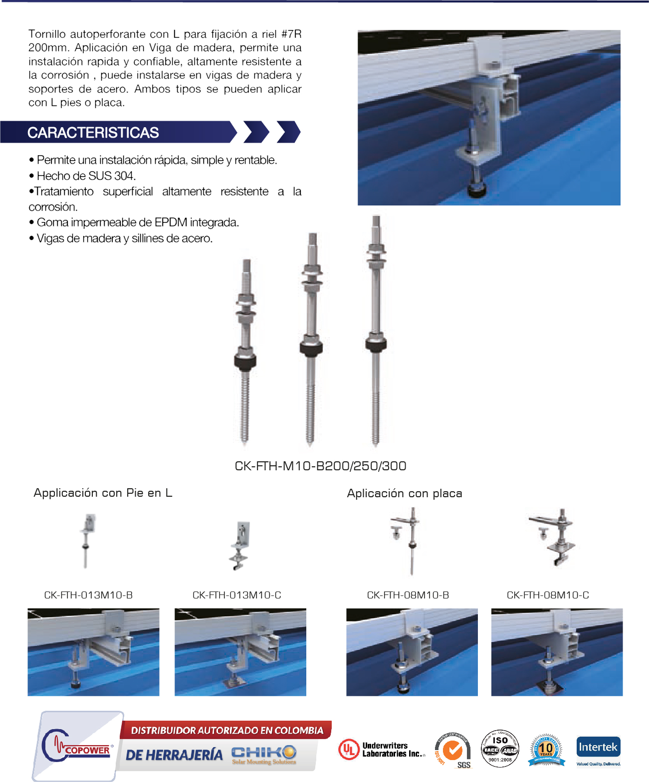 Tornillo autoperforante con L para fijación a riel #7R 200 mm. Aplicación en viga de madera, permite una instalación rápida y confiable, altamente resistente a la corrosión, puede instalarse en vigas de madera y soportes de acero. Ambos tipos se pueden aplicar con L pies o placa.