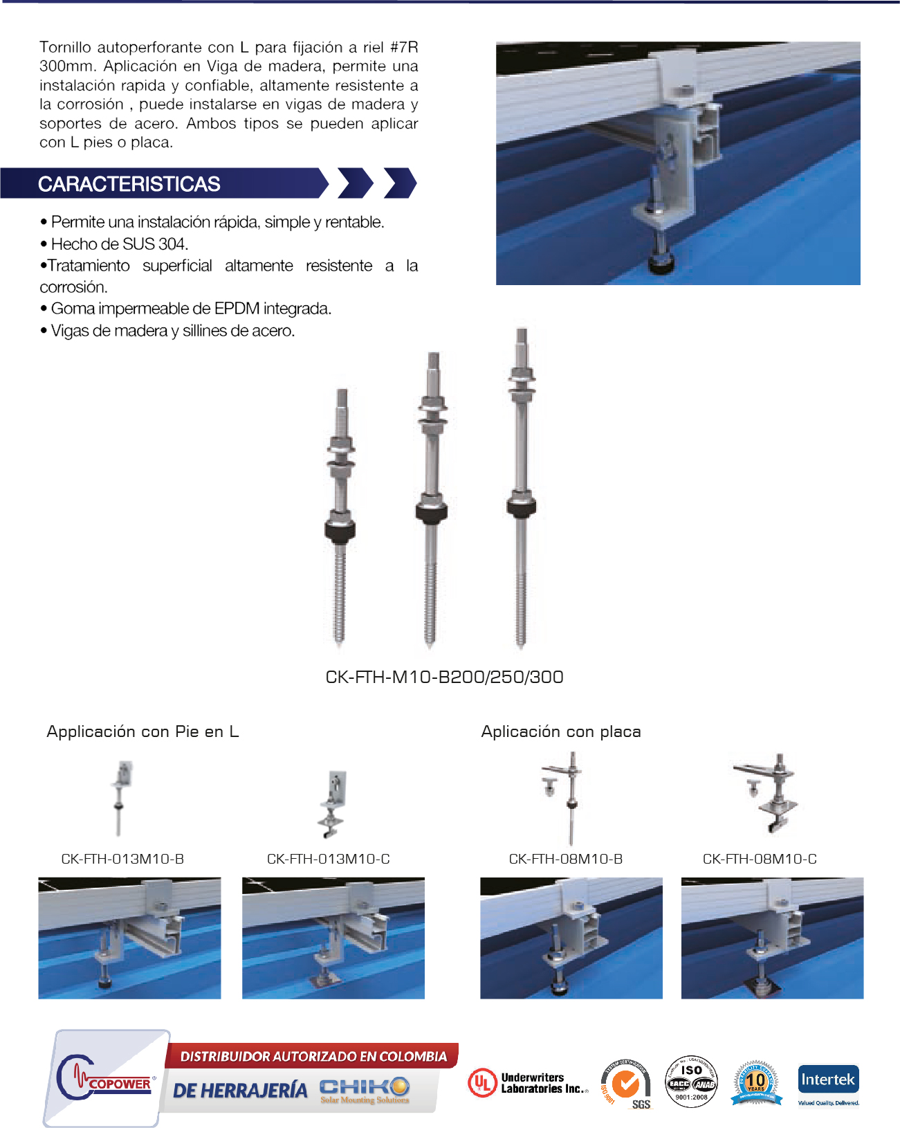 Tornillo autoperforante con L para fijación a riel #7R 300 mm. Aplicación en viga de madera, permite una instalación rápida y confiable, altamente resistente a la corrosión, puede instalarse en vigas de madera y soportes de acero. Ambos tipos se pueden aplicar con L pies o placa.